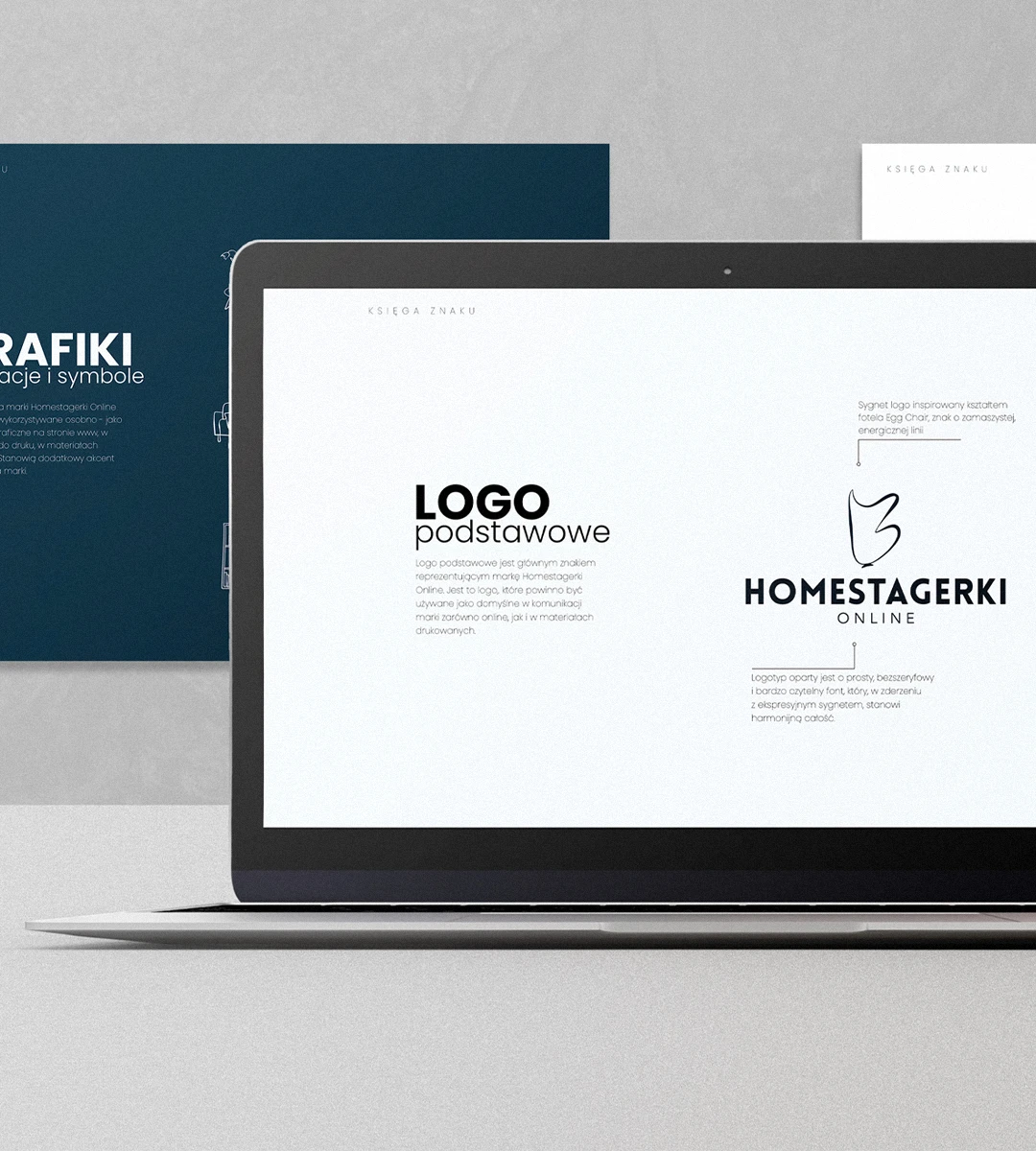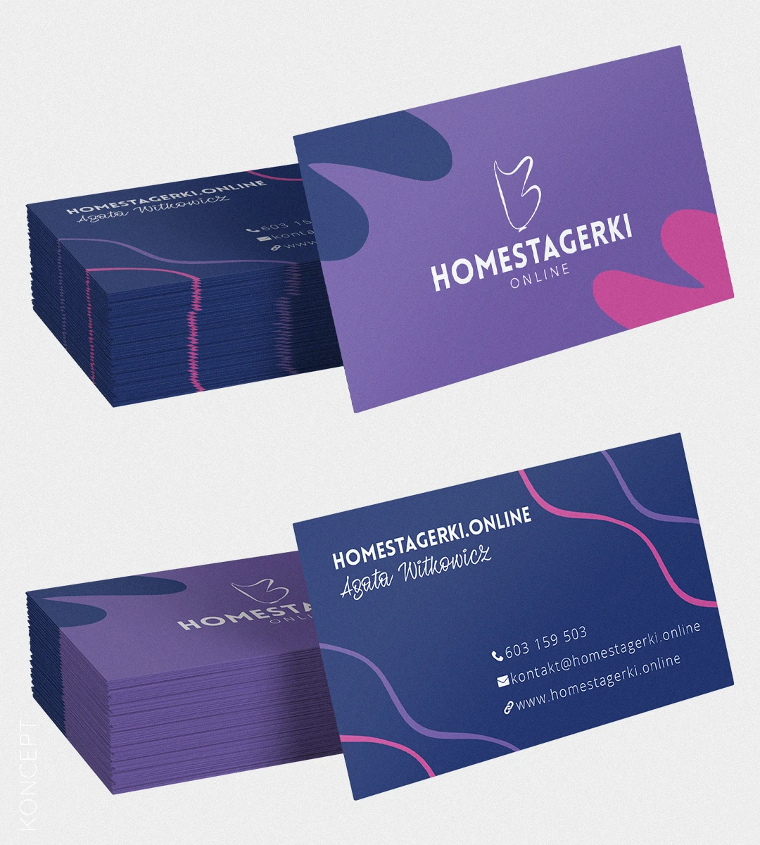 Identyfikacja wizualna została zaprojektowana z myślą o nowoczesności i elegancji, aby odzwierciedlać profesjonalizm oraz zaangażowanie marki w edukację i wsparcie kobiet w branży home stagingu. Logo łączy w sobie subtelne elementy graficzne nawiązujące do aranżacji wnętrz oraz stylową typografię, tworząc unikalny znak rozpoznawczy. Paleta kolorów opiera się na głębokich odcieniach granatu, fuksji, fioletu i błękitu, które symbolizują kreatywność, pewność siebie i profesjonalizm, jednocześnie nadając marce wyróżniający się, dynamiczny charakter.