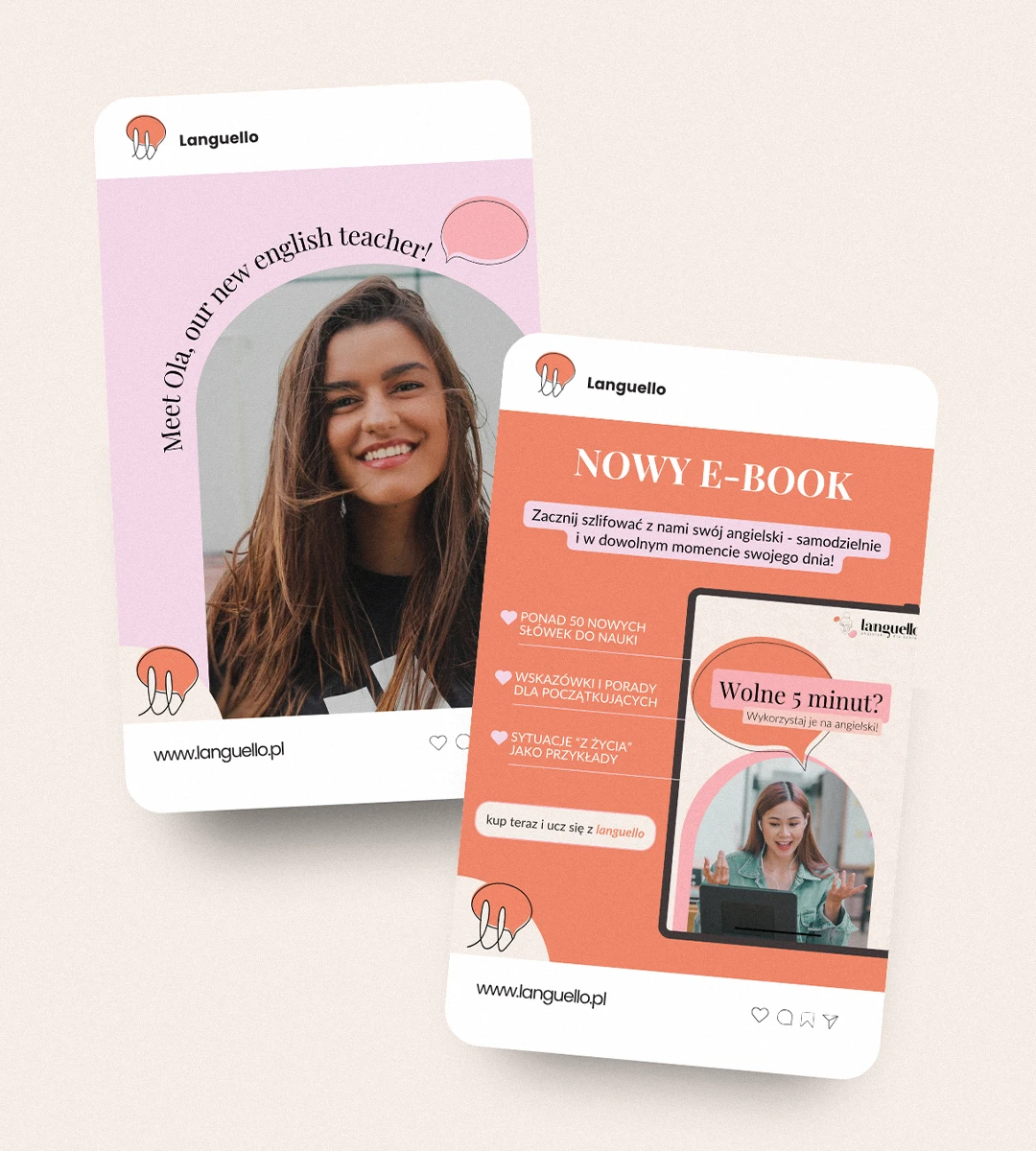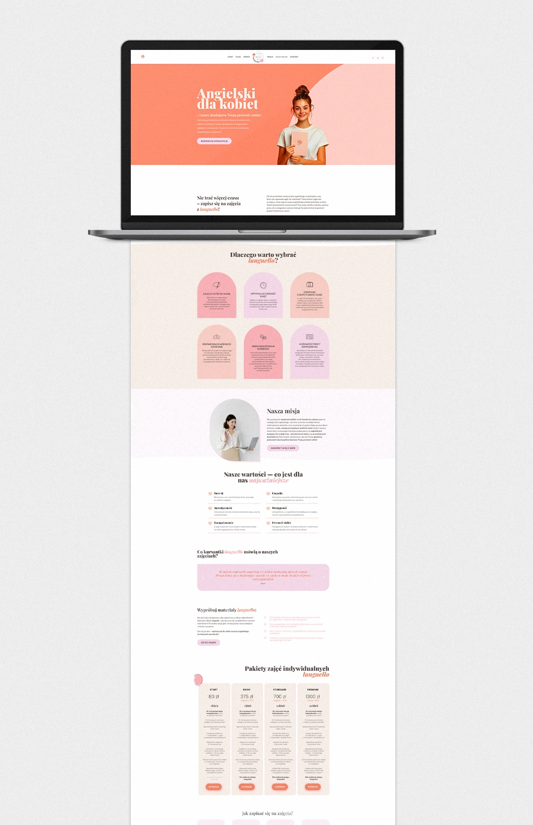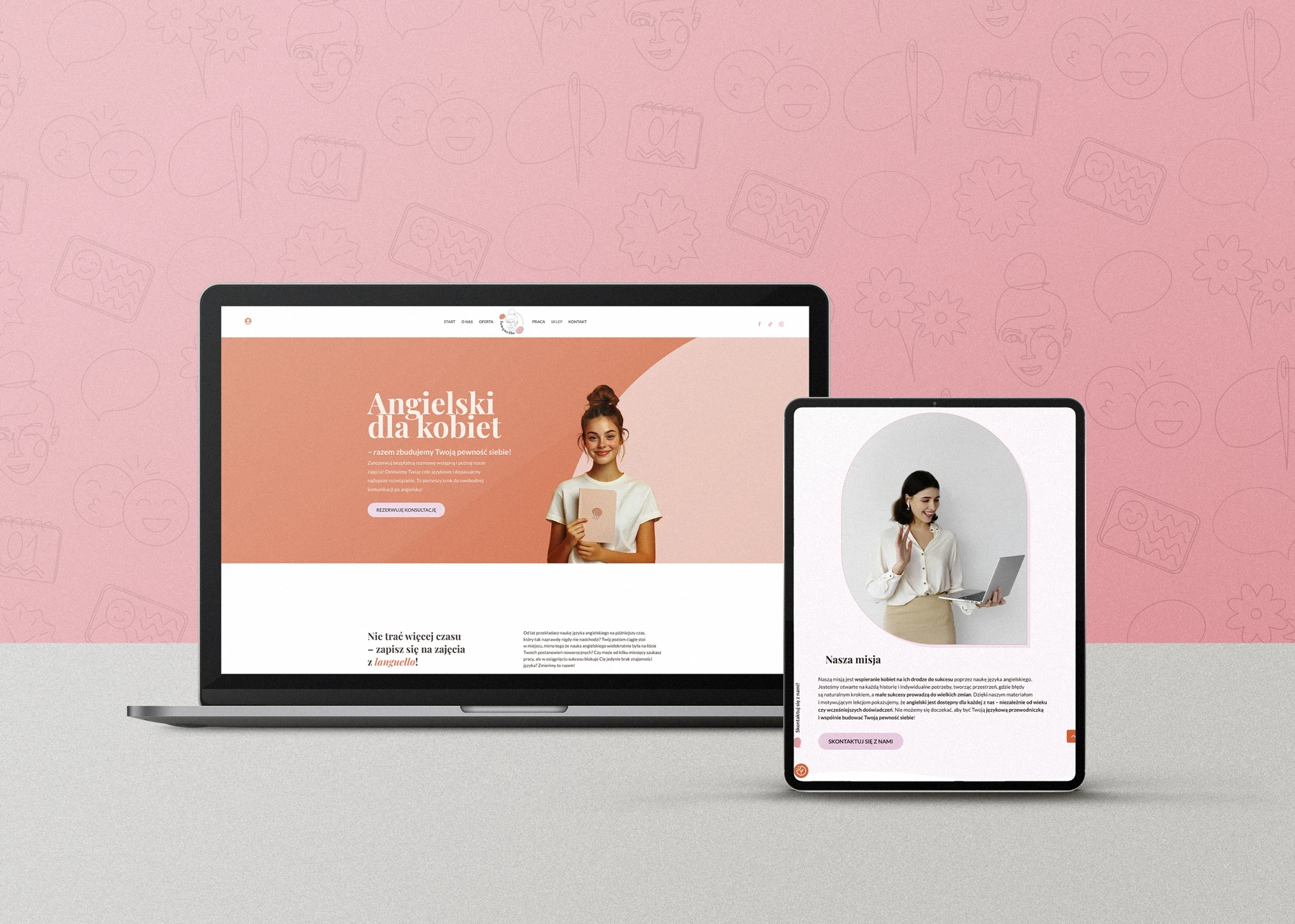 Dla marki Languello zaprojektowałam identyfikację wizualną oraz stronę internetową z funkcją sklepu online. To projekt, który miał oddać lekki, kobiecy i wspierający charakter marki stworzonej z myślą o kobietach uczących się języka angielskiego – w swoim tempie, bez presji i z pełną akceptacją.