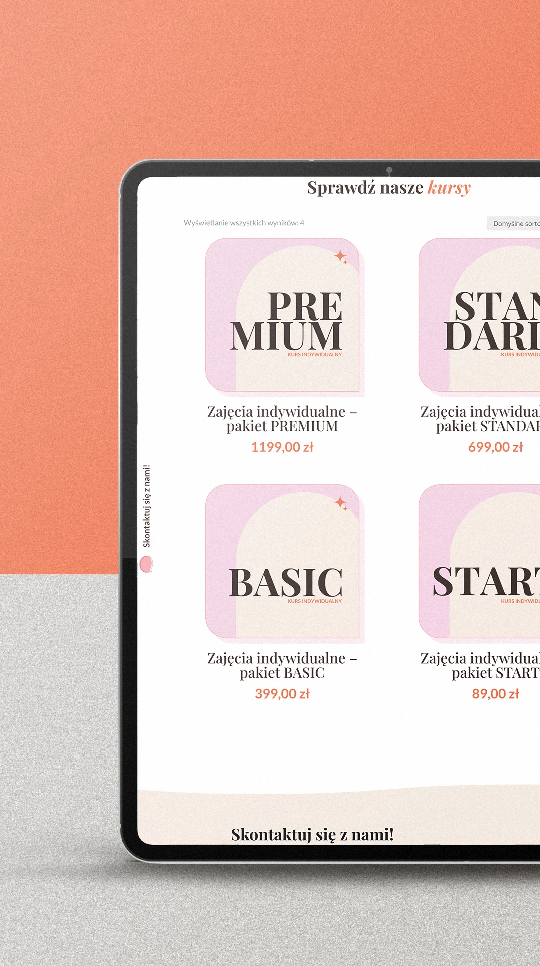 Strona www została zaprojektowana z myślą o użytkowniczkach, które szukają prostoty, intuicyjności i przejrzystości. Jasna struktura, spokojny design i komfortowy sklep online sprawiają, że odwiedzająca czuje się „zaopiekowana” – dokładnie tak, jak w rozmowie z dobrą nauczycielką języka.