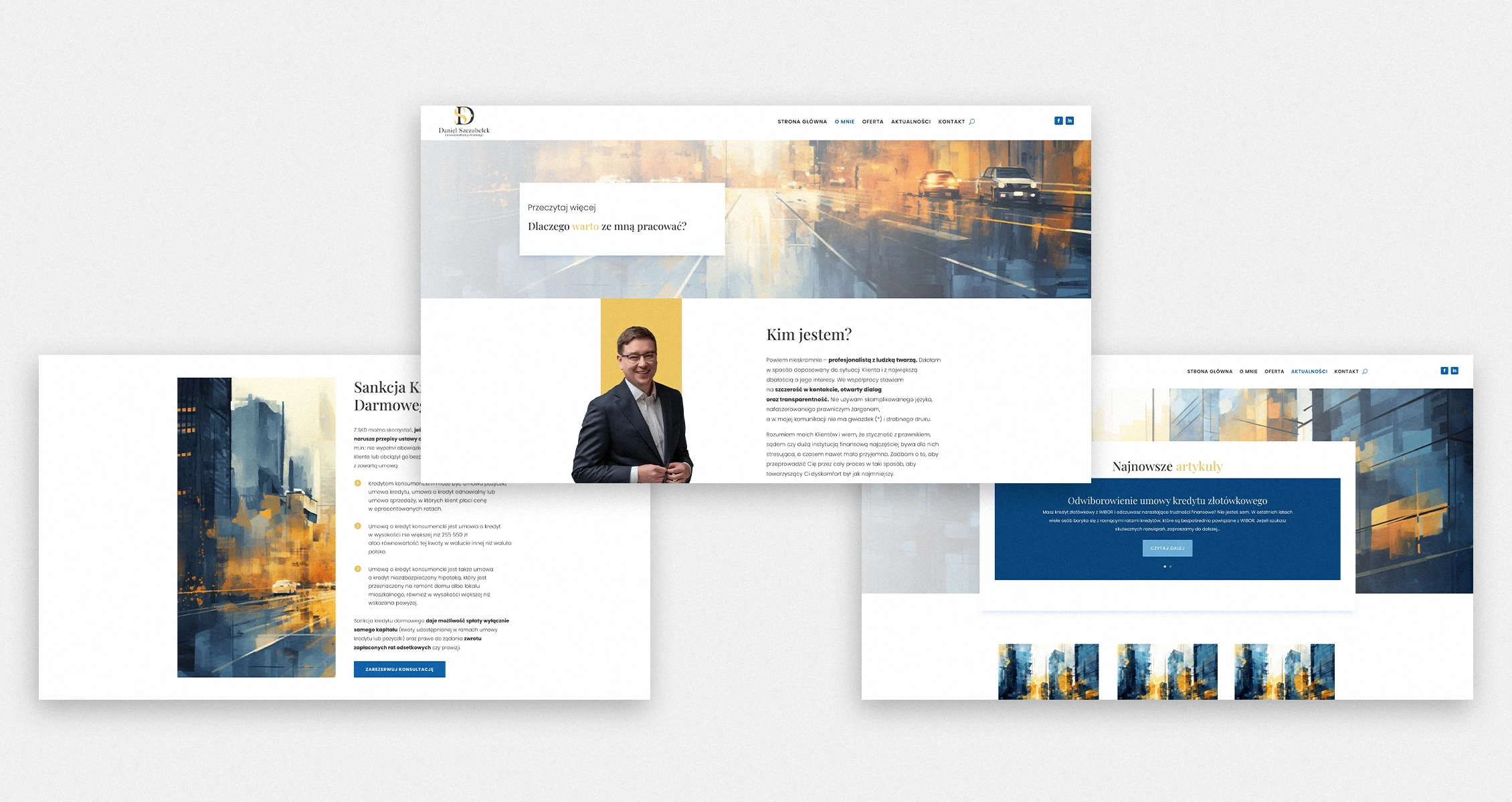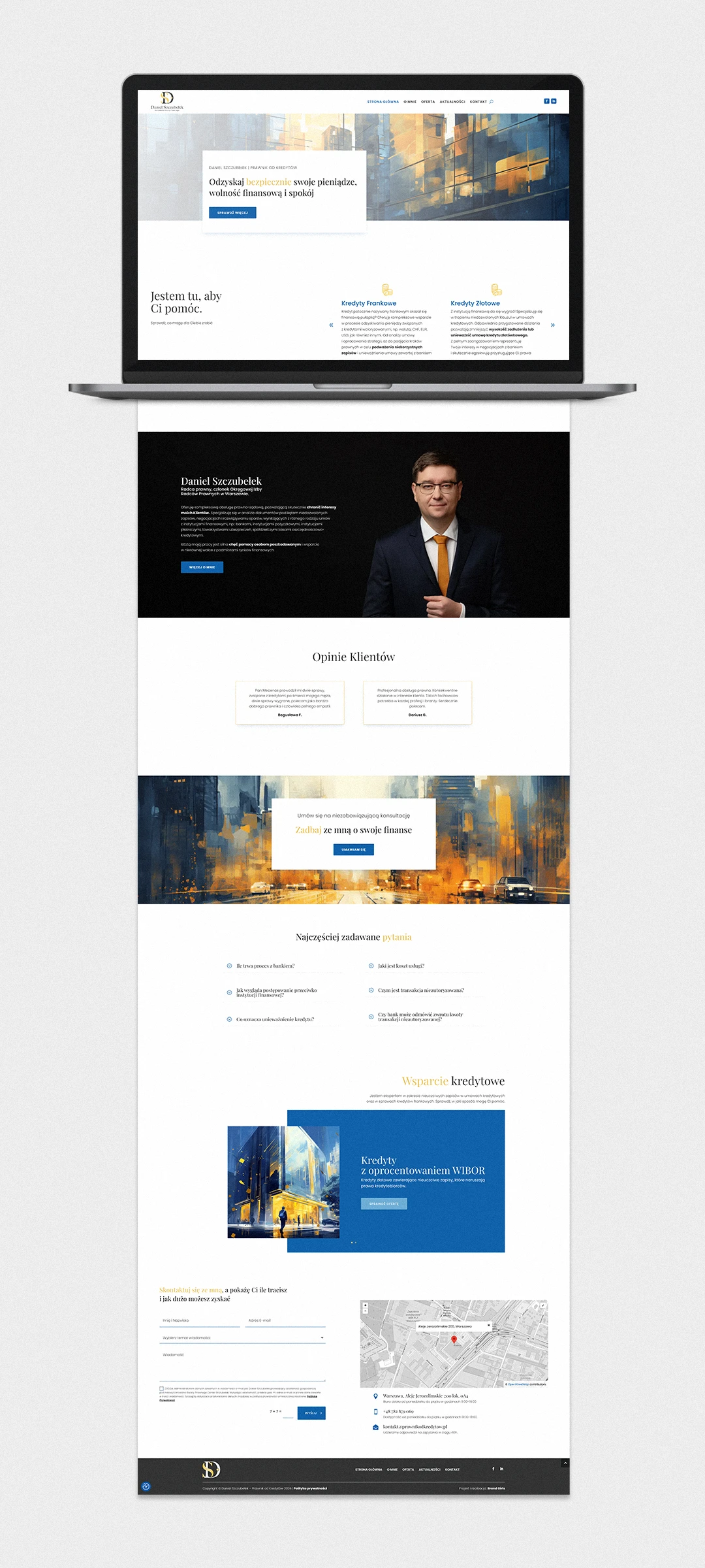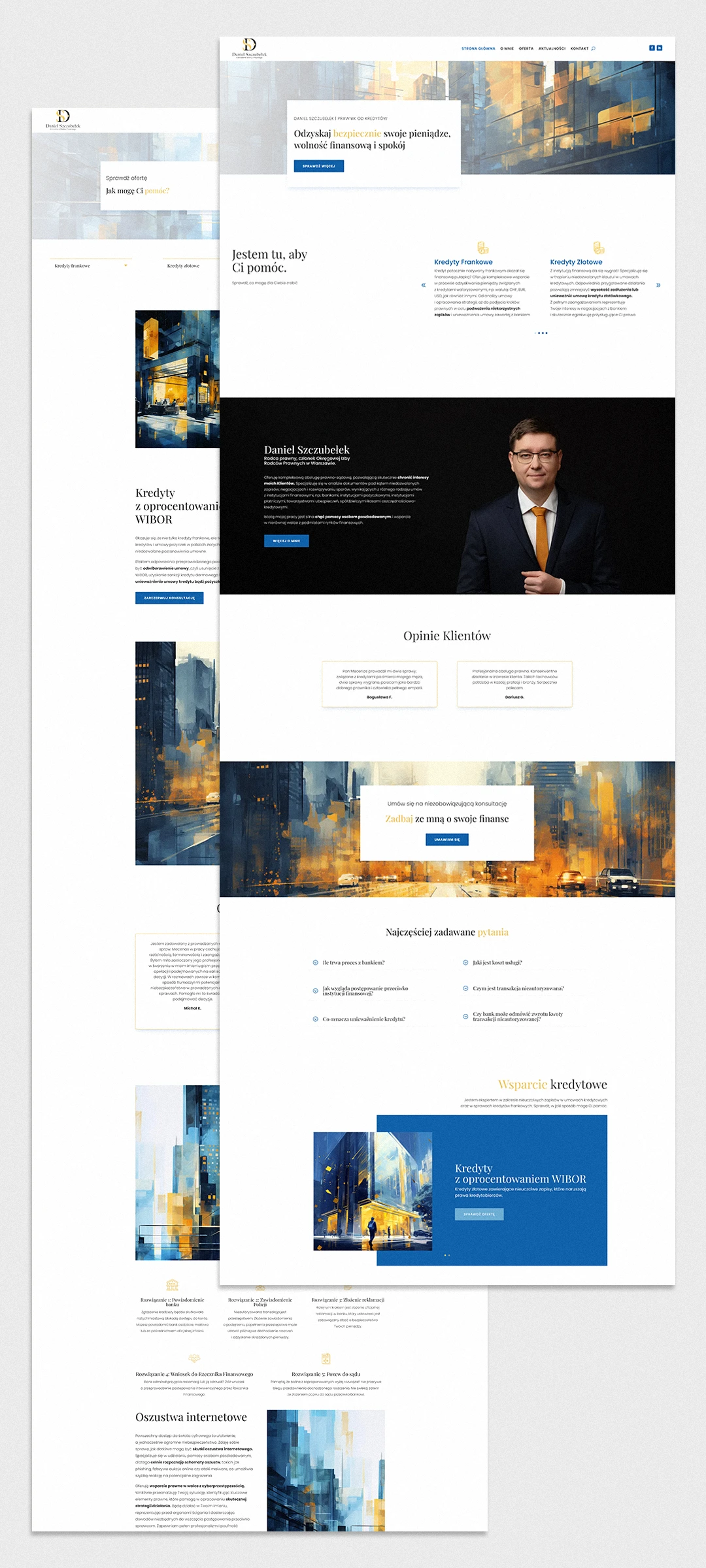 Dla marki „Prawnik od Kredytów” Daniela Szczubełka zaprojektowałam nowoczesną i funkcjonalną stronę internetową, która odzwierciedla profesjonalizm oraz zaangażowanie w pomaganiu klientom zmagającym się z problemami kredytowymi. Celem projektu było stworzenie przejrzystej platformy, ułatwiającej użytkownikom dostęp do informacji o usługach oraz umożliwiającej szybki kontakt z kancelarią.